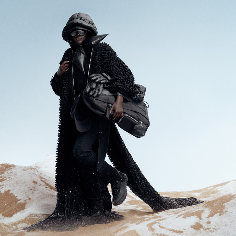 A visionary co-creation: technical knitwear layers under bold outerwear, all in a sleek black palette.