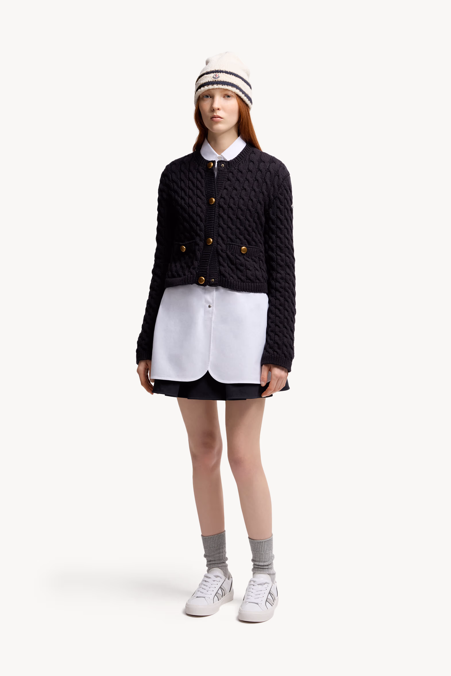 Distinguished through its cable knit finish, this cardigan is crafted from a cotton blend. The crew neck is completed by gold-toned hardware, adding a sophisticated finishing touch.