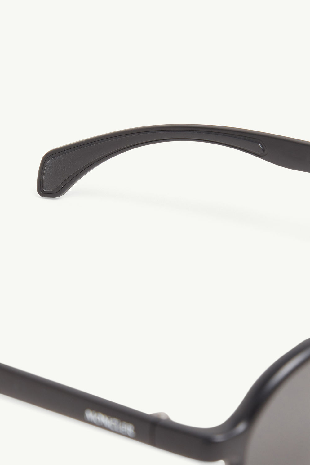 Gli occhiali da sole Caprice da uomo e da donna presentano un’audace montatura nera che ne accentua la forma ovale arrotondata.